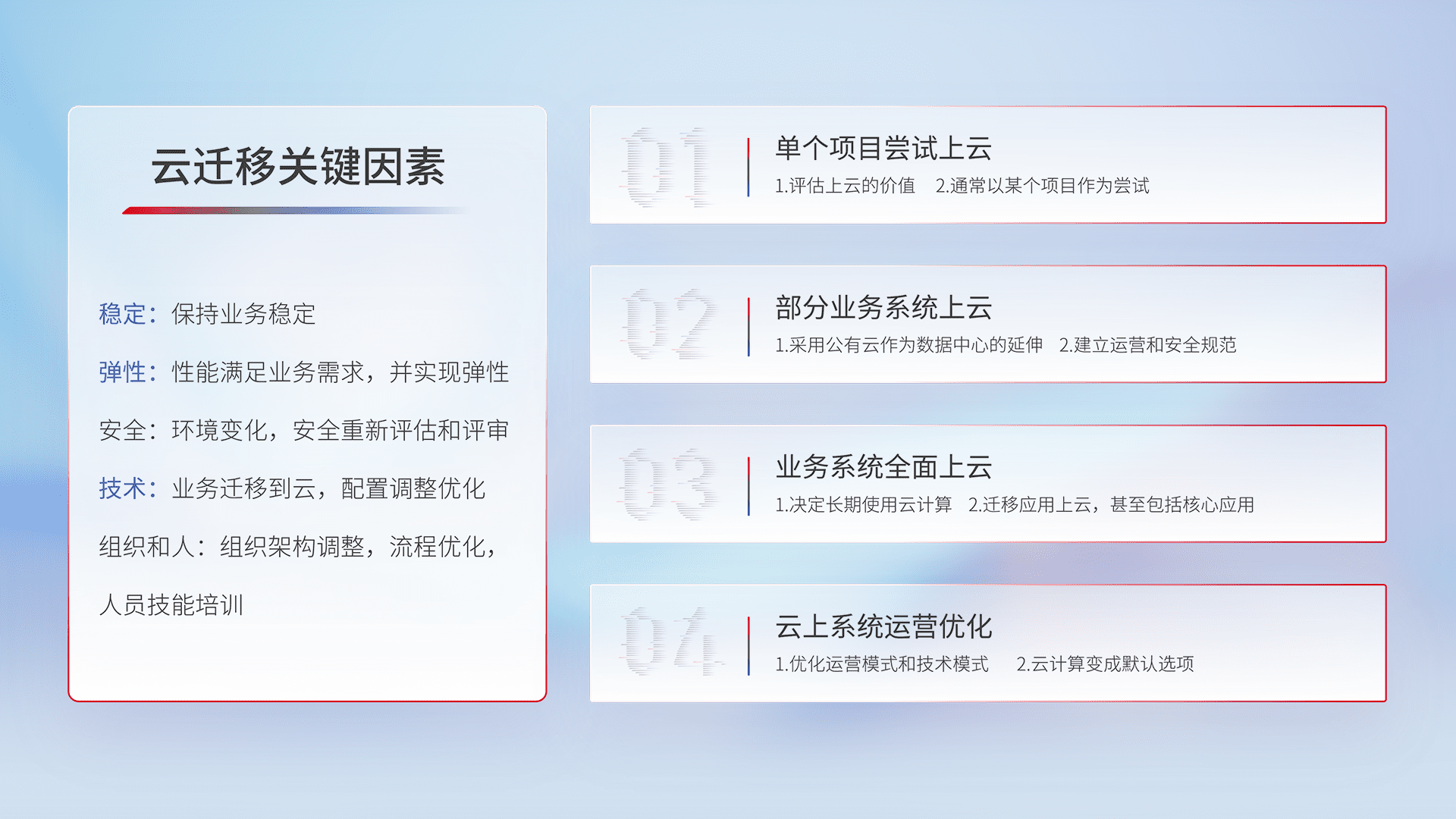 结合实际业务,,,,从规划设计、、、云平台选型、、、、云原生改造、、、数据迁移、、、集成交付,,迁移全过程为客户识别最佳上云路径,,做好风险识别管理,,,设计网络架构、、、身份权限、、、安全审计合规、、、、操作审计、、日志审计、、、、监控告警策略、、多站点容灾设计等,,对云上基础设施进行整体规划,,,,提升IT治理水平,,,,以满足弹性、、、高可用、、、高性能的需求。。。