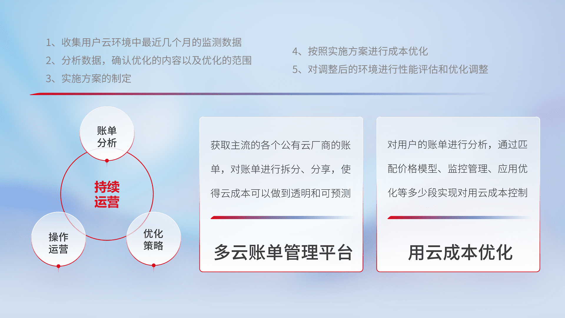 通过多云纳管,,,,以统一的资源数据模型把客户的云资源进行抽象和封装,,,进而实现对多云资源的统一操作,,保障云资源管理的可靠性、、、稳定性与可用性。。量身定制化运维内容,,配置、、、、开发运维、、补丁管理、、、、备份、、、、监控、、、、认证和访问管理、、、审计和日常巡检等,,,保障在用云过程中的可靠度,,,,稳定度以及高可用率。。