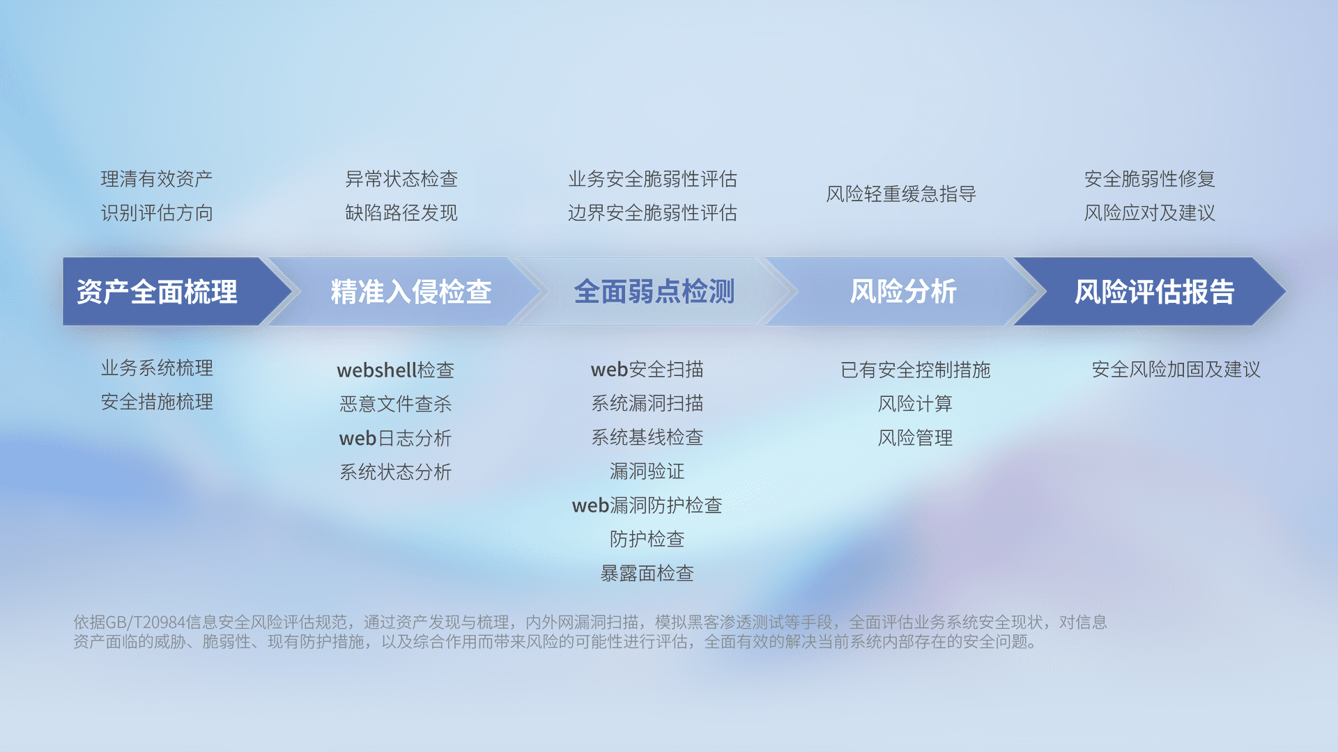 针对客户行业特性,,,以专业的安全服务+多厂商联合解决方案提供专属的一站式安全管理服务,,,,帮助客户全面感知网络空间威胁,,,,基于识别、、、、检测、、、分析、、防护、、、监测、、、、响应的服务理论模型,,,,从方案咨询、、、、集成交付、、、评估验证、、、优化加固、、、运维运营,,,致力于为客户提供完整的闭环管理式安全服务。。。。以实战经验为客户打造高抵御风险的安全体系,,,帮助客户发现威胁、、、、对抗威胁、、、处置威胁,,,,不断积累安全对抗能力,,,,持续保障数字化安全。。。